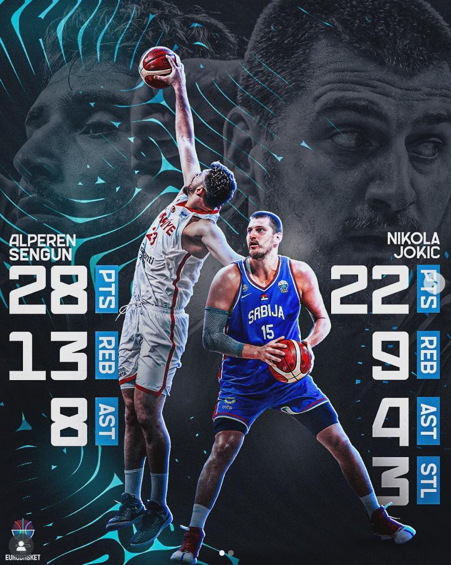 土耳其的核心中锋申京已经快速成长为FIBA顶级内线了,现在面对约基奇也不落下风,他在这一场比赛里独得28分13篮板8助攻,表现非常出色。